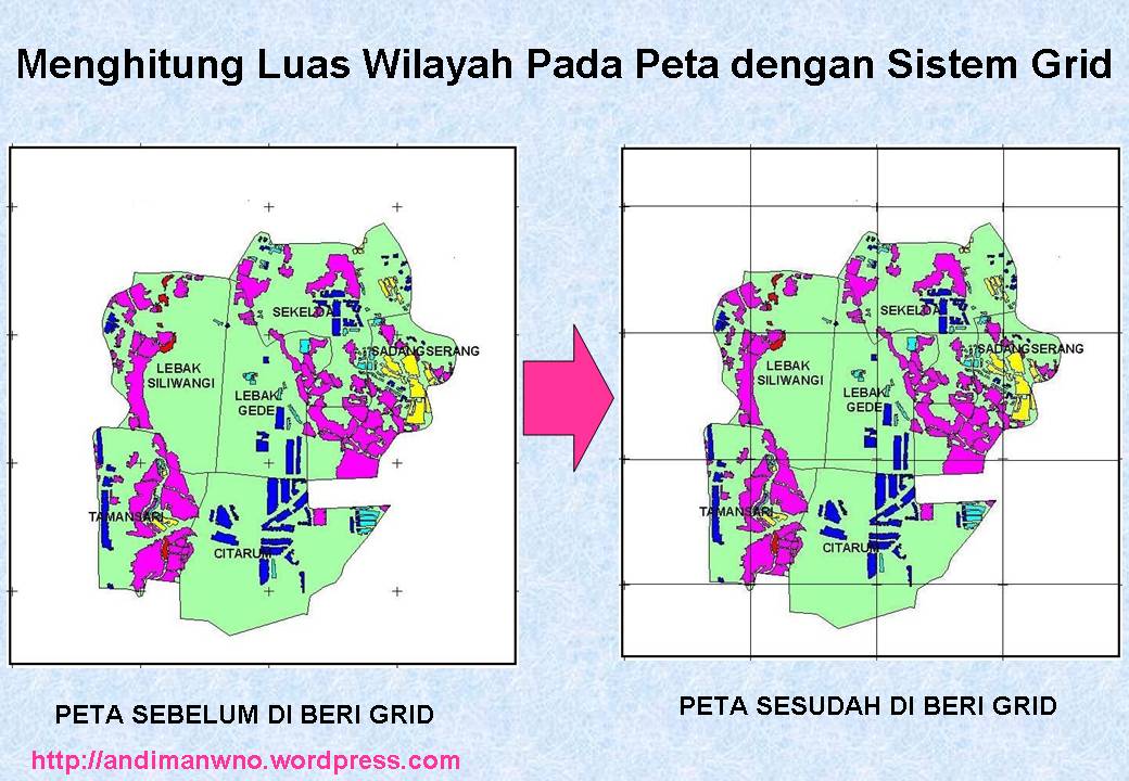 Gambar pada suatu peta terbentuk atas unsur titik (dot), garis (line), dan area (poligon). Poligon merupakan garis tertutup yang kedua ujungnya saling bertemu dan membentuk area. Area yang terbentuk ini akan membentuk luasan yang dapat kita ukur/hitung berapa besarnya. Menghitung luas suatu wilayah pada peta dapat kita lakukan secara manual dengan menggunakan Sistem Grid.