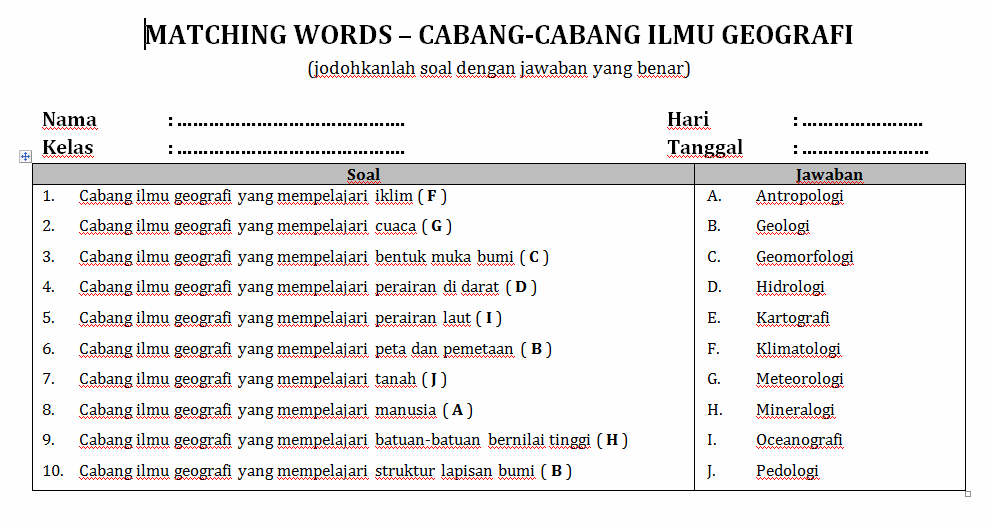 Pada kegiatan pembelajaran Geografi, soal dengan model menjodohkan ini juga bisa dibuat. Ada cukup banyak materi/bahasan dalam pelajaran Geografi yang bisa dibuat soalnya dalam bentuk soal menjodohkan ini. Salah satu soal menjodohkan yang bisa dibuat adalah bahasan cabang ilmu Geografi seperti pada gambar di atas.
