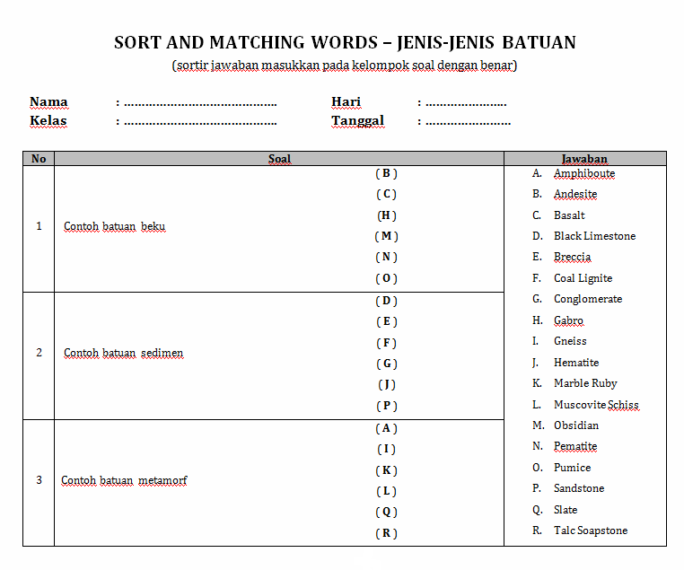 Seperti pada tampilan gambar di atas, bentuk soal menjodohkan ini saya beri nama Sort and Matching Words. Pada bentuk soal ini, jumlah pertanyaan yang ada di kolom soal/pertanyaan tidak banyak tetapi jumlah jawaban yang disediakan di kolom jawaban lebih banyak.