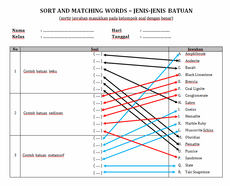 Mensortir jawaban dan menjodohkan ke soal = – = – = Soal menjodohkan pada prinsip pengerjaannya adalah siswa membuat garis yang menghubungkan soal/pertanyaan di kolom soal dengan jawaban yang ada di kolom jawaban, atau cukup menuliskan huruf/nomor jawaban ke titik-titik/kotak/tanda kurung di dekat kalimat soal. Soal dengan model menjodohkan soal – jawaban ini cenderung lebih banyak digunakan di jenjeng Sekolah Dasar (SD) atau Sekolah Menengah … Lanjutkan membaca Download Contoh Variasi Soal Menjodohkan Geografi 02