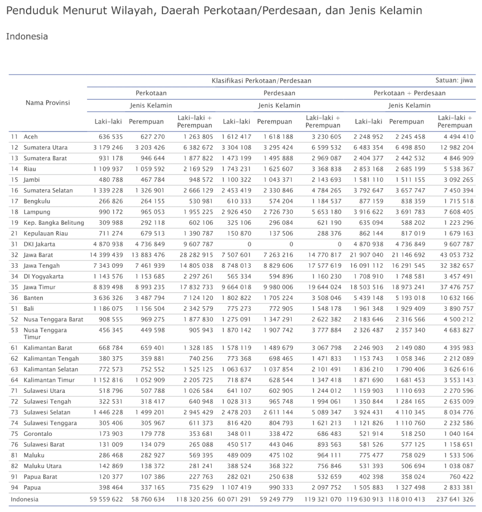 Contoh data penduduk secara geografis dari hasil sensus penduduk Indonesia 2010 adalah :