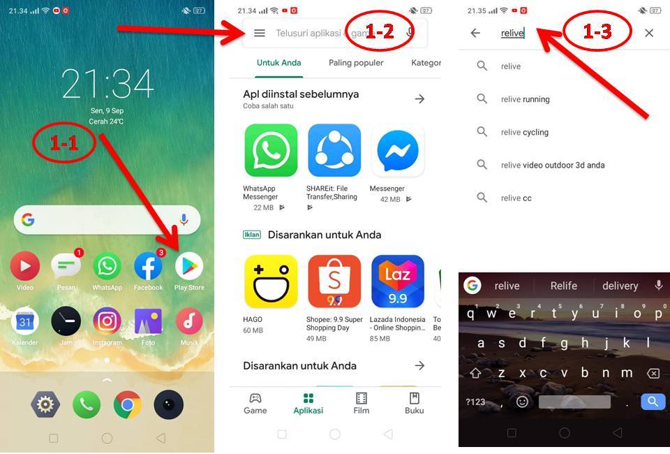 Buka aplikasi playstore (1-1), ketikkan relive (1-2) sampai muncul autotext relive (1-3)