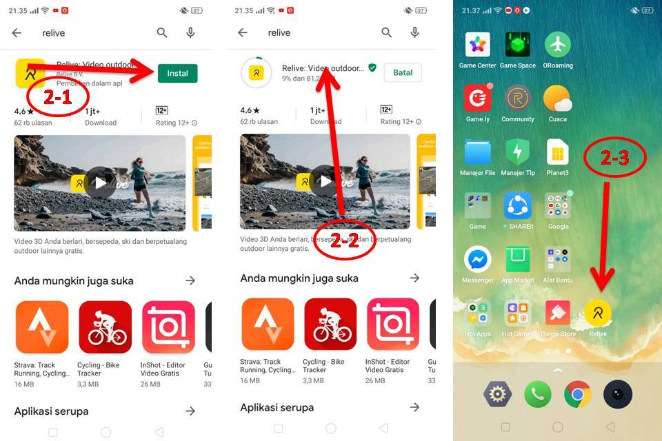Klik tombol install (2-1), tunggu sampai proses instalasi selesai (2-2). Jika instalasi selesai dihalaman depan akan muncul icon Relive (2-3)