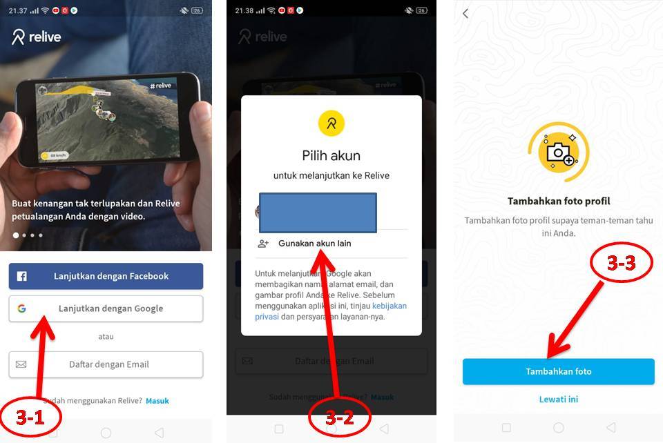 Muncul konfimasi untuk login (3-1), dapat menggunakan akun Facebook atau akun Gmail (3-2). Jika sudah memilih akun login akan muncul pesan diminta untuk menambahkan foto profil. Dapat langsung ditambahkan atau lewati dulu (ditambahkan nanti) (3-3)