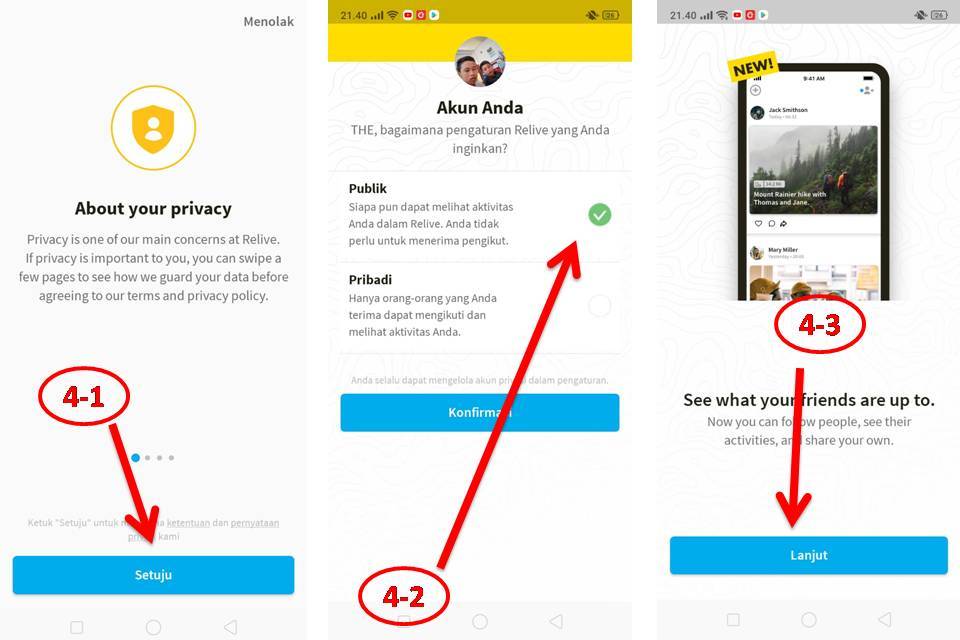 Setting privacy akun (4-1), pilih publik (dilihat oleh semua pengguna relive) atau pribadi (hanya kita dan orang-orang yang kita perbolehkan melihat) (4-2), lalu klik lanjut (4-3).