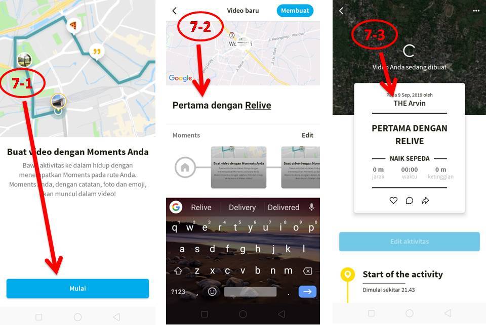 Buat video perjalanan dengan klik Mulai (7-1), tambahkan judul untuk video(7-2). Tunggu sampai judul muncul(7-3).