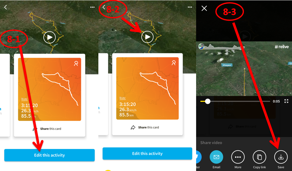 Klik edit this activity (8-1)jika ada yang perlu diubah, share this card untuk berbagi rute dalam tampilan maps. Jika ingin menyimpan video rute dalam tampilan terrain klik tombol pada langkah (8-2) dan klik save (8-3). Tunggu beberapa saat, video jadi dan tinggal kita simpan ke Smartphone kita atau langsung kita bagikan ke storyline, status FB dll.