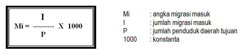Rumus menghitung angka migrasi ada tiga yaitu Mi (Migrasi In) untuk menghitung angka migrasi masuk, Mo (Migrasi Out) untuk menghitung angka migrasi keluar dan Mn (Migrasi Netto) untuk menghitung angka migrasi selisih antara penduduk pendatang dengan penduduk pergi.