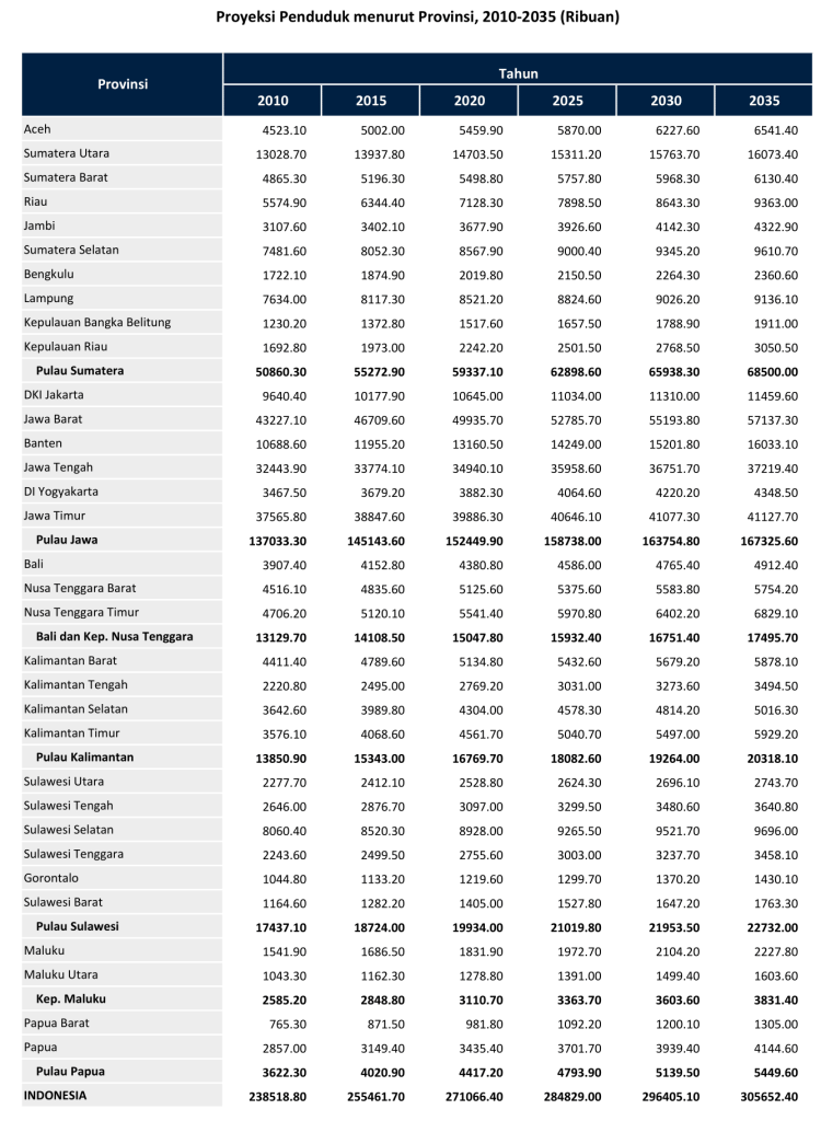 Berdasarkan proyeksi penduduk dari BPS, jumlah penduduk di Indonesia akan terus meningkat dan bertambah mencapai 300 juta jiwa pada tahun 2035.