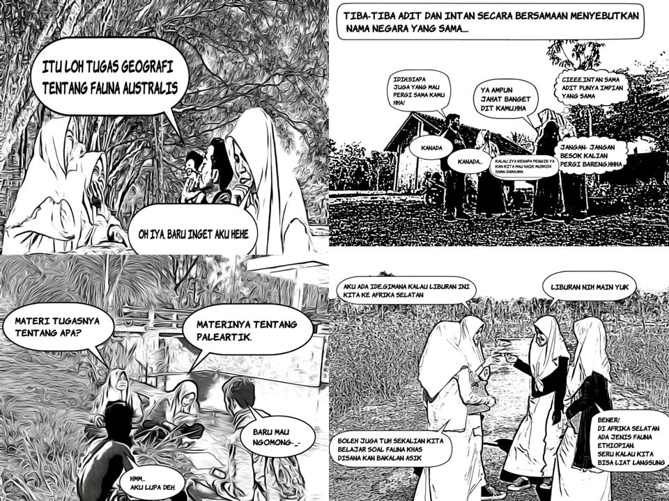 Tugas membuat komik yang saya berikan di kelas XI IPS 1 2019-2020 ini tentang persebaran fauna di dunia. Ide cerita sepenuhnya saya bebaskan kepada siswa untuk memilih dan menyusun sendiri. Dengan memberikan sedikit arahan tentang aplikasi yang digunakan serta memberikan cara pengerjaannya secara sekilas sudah cukup bagi para siswa untuk memulai mengerjakan video komik.
