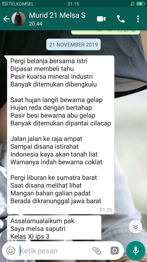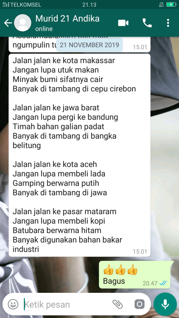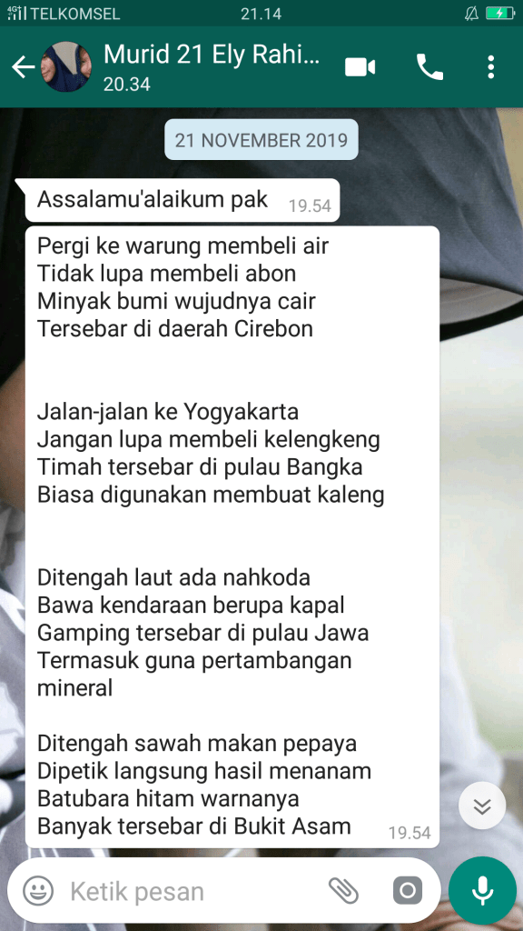 Pantun buatan siswa-siswa ini kemudia saya minta untuk dikirimkan lewat WA dan saya minta untuk dibacakan pada pertemuan setelah kegiatan ulangan berkala.