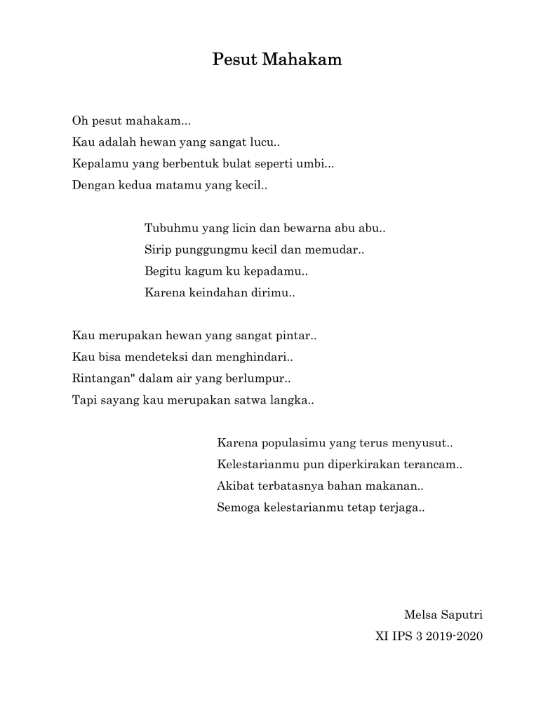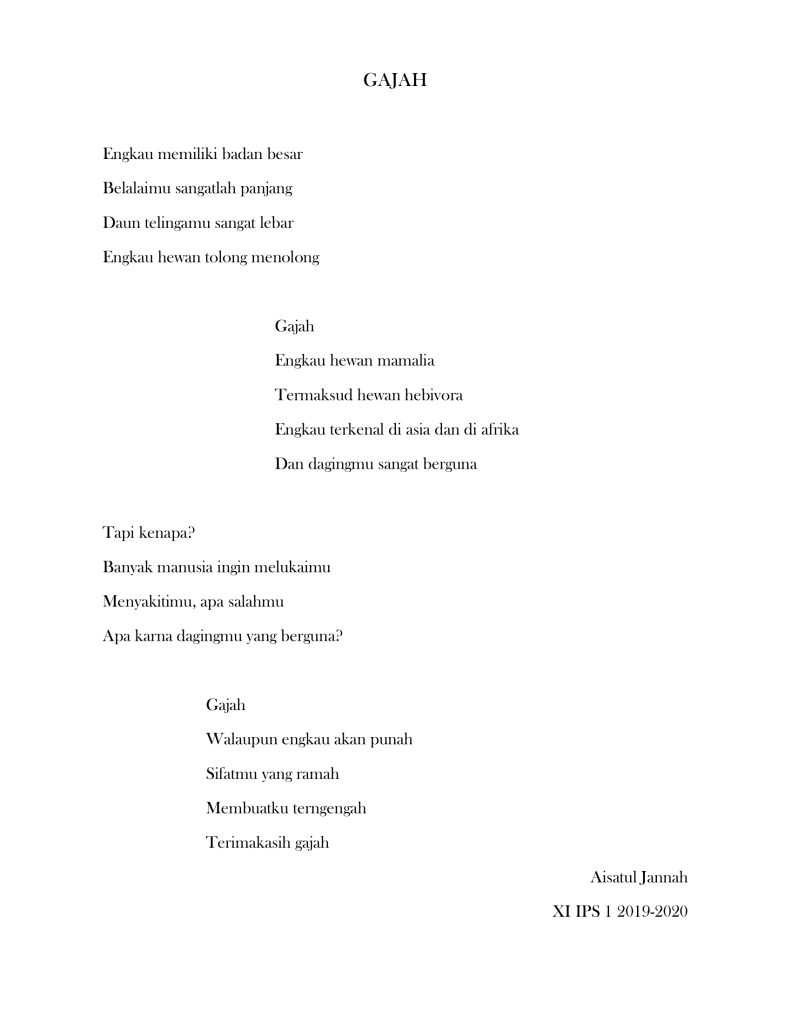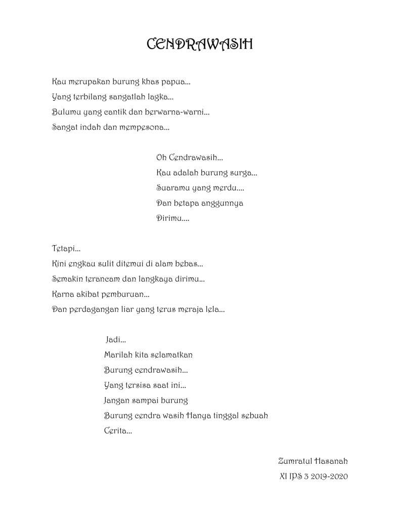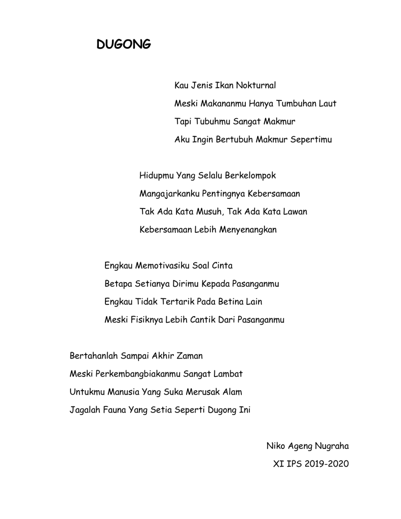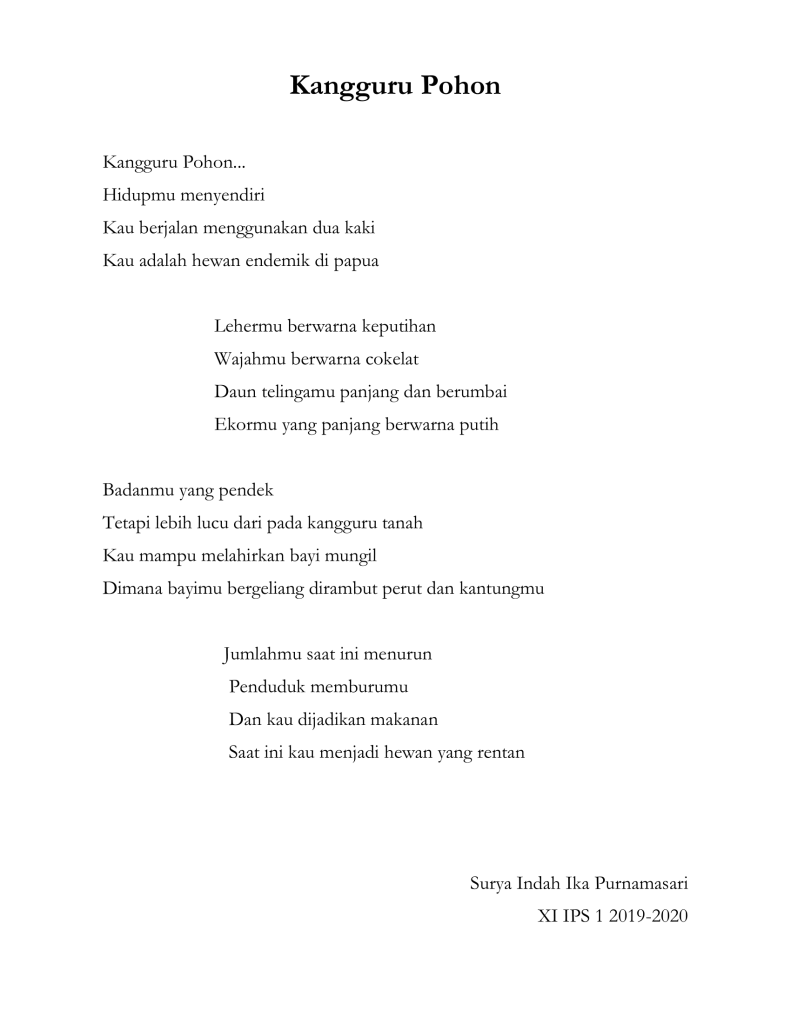 Ada cukup banyak puisi buatan siswa-siswi kelas XI IPS tahun pelajaran 2019-2020 yang bercerita tentang beberapa jenis fauna khas yang ada di Indonesia di mulai dari puisi tentang badak bercula satu, gajah sumatra, trenggiling, burung maleo, orang utan, kanguru, kanguru pohon, kumbang badak, anoa, komodo, burung namudur, pesut mahakam, dugong, merak, cendrawasih, babirusa, burung raja udang dan burung kakatua.