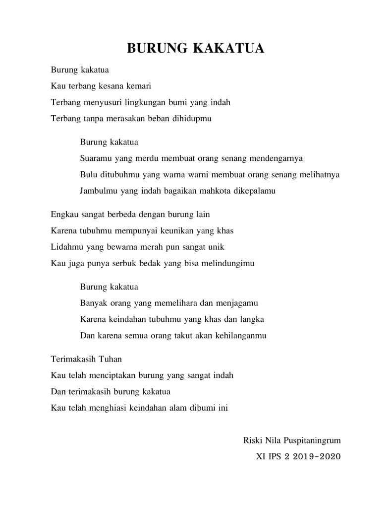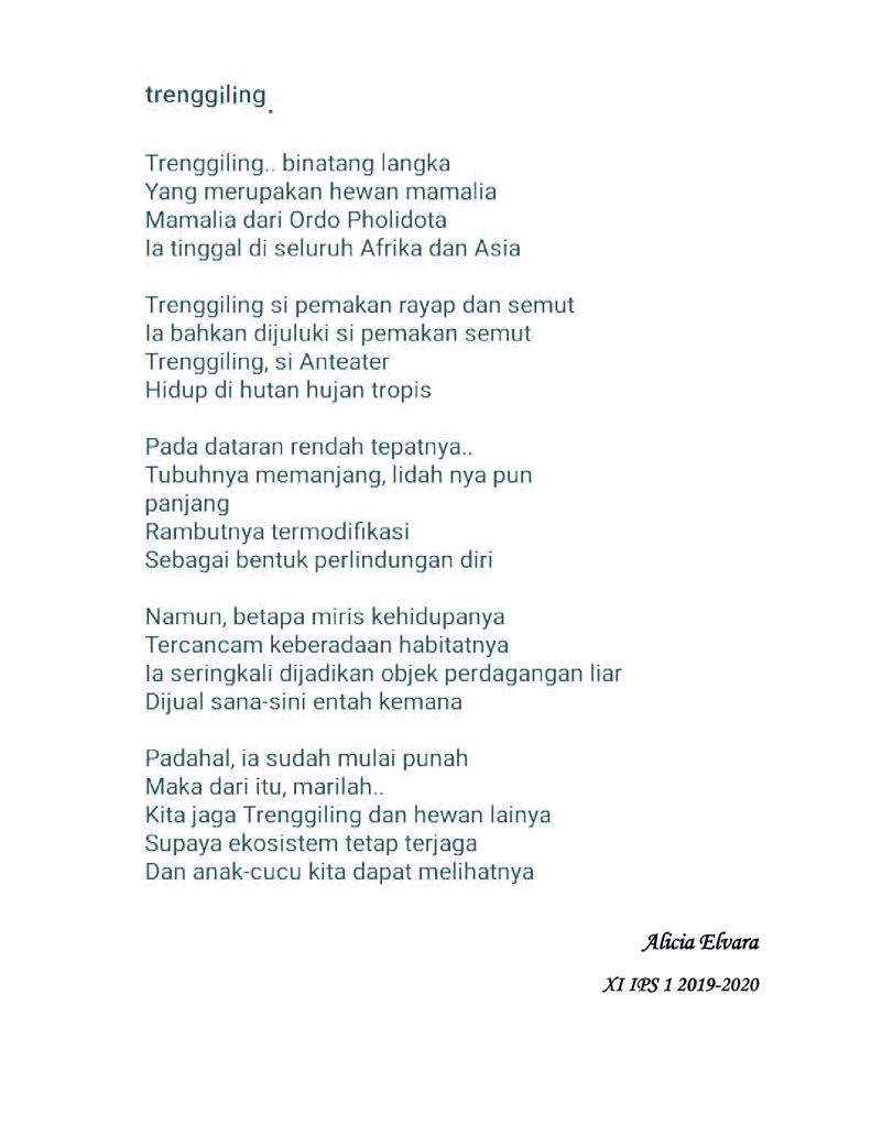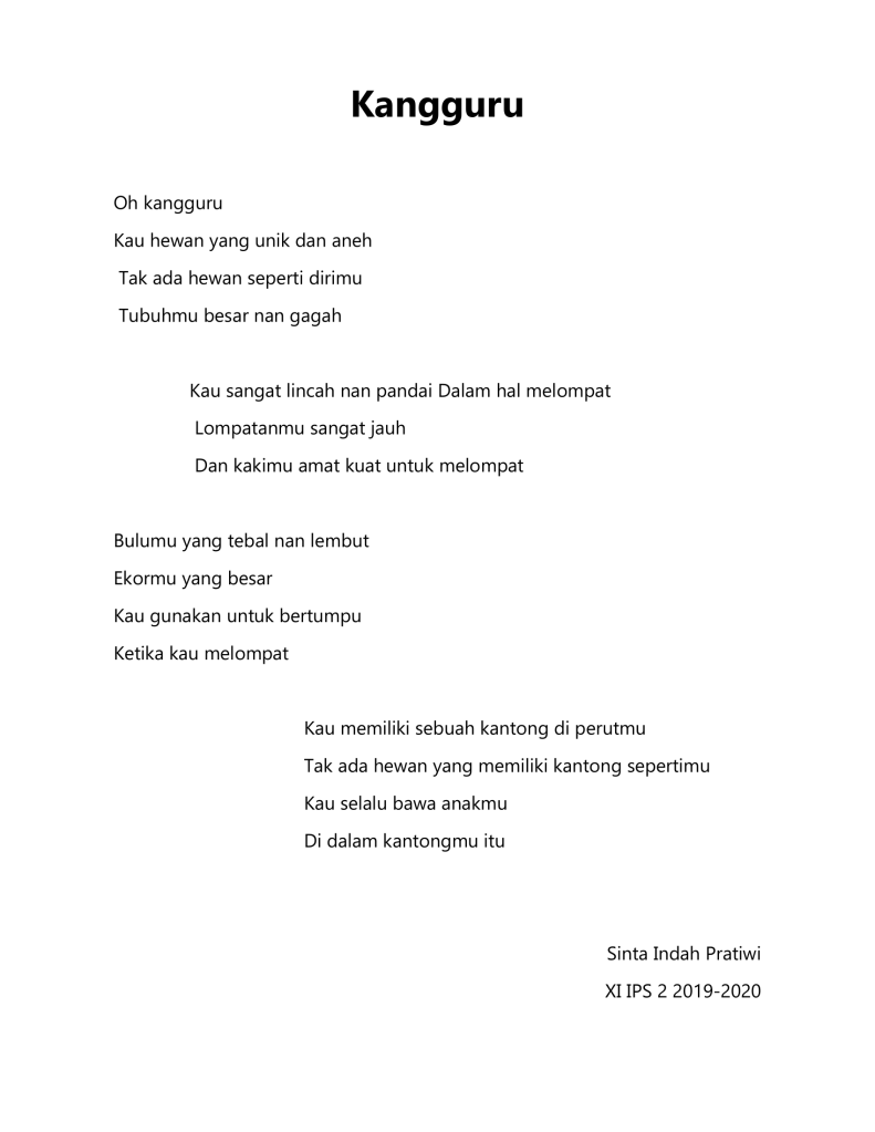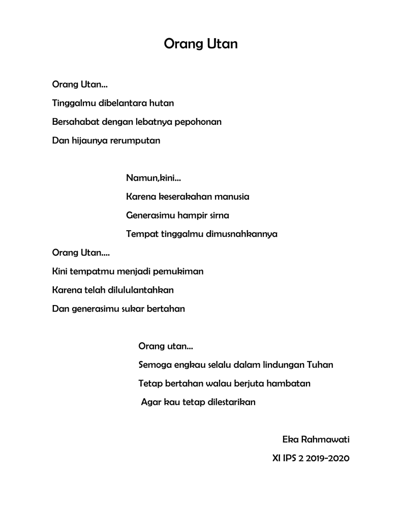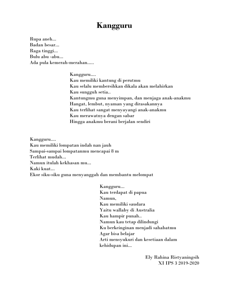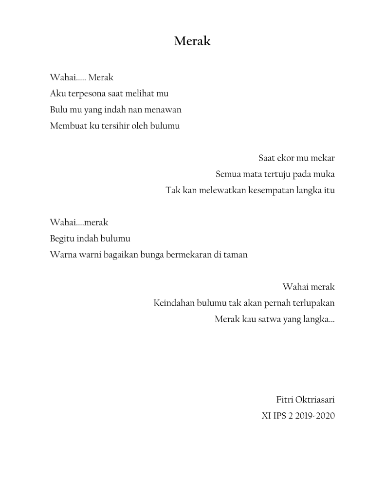 Ada cukup banyak puisi buatan siswa-siswi kelas XI IPS tahun pelajaran 2019-2020 yang bercerita tentang beberapa jenis fauna khas yang ada di Indonesia di mulai dari puisi tentang badak bercula satu, gajah sumatra, trenggiling, burung maleo, orang utan, kanguru, kanguru pohon, kumbang badak, anoa, komodo, burung namudur, pesut mahakam, dugong, merak, cendrawasih, babirusa, burung raja udang dan burung kakatua.