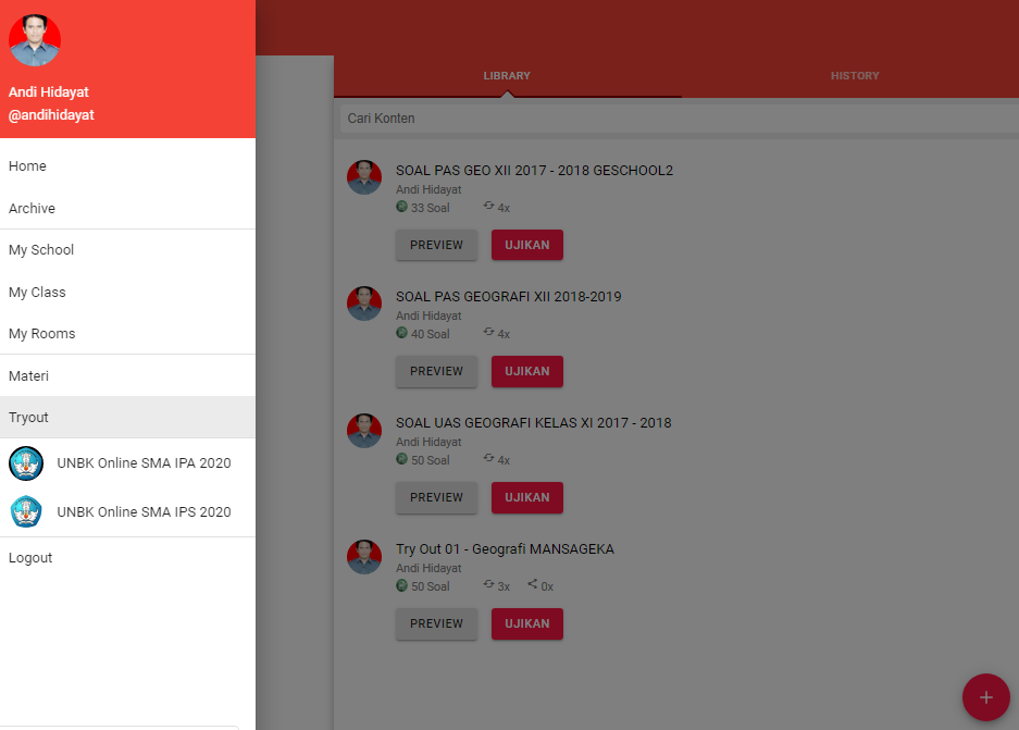 Gambar 07. Kemudian kita juga dapat menguplod soal yang akan kita gunakan sebagai soal untuk penilaian baik Penilaian Harian, Tugas maupun PAS/PAT lewat menu Try Out. Untuk melaksanakan penilaian ini guru dapat menguplod soalnya sendiri atau menggunakan konten soal dari guru/sekolah lain.