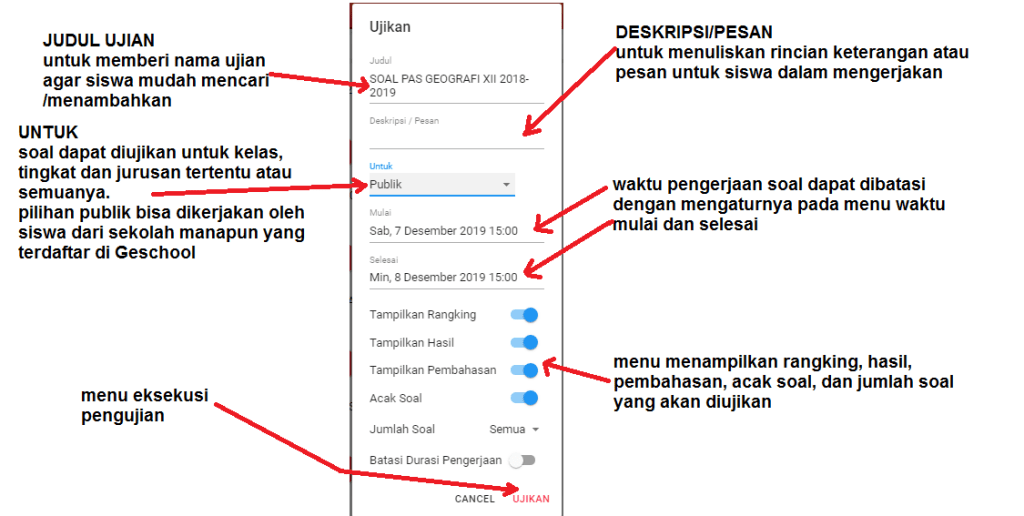 Gambar 09. Setelah klik menu ujikan kemudian kita lakukan setting pelaksanaannya. Setting ujian ini meliputi Judul