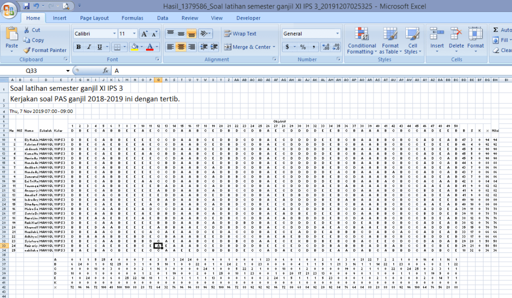 Gambar 13. Hasil analisis sederhana yang meliputi benar salah jawaban dan sebaran jawaban pada setiap option dapat kita download dalam format file xls yang bisa dibuka menggunakan Microsoft Excel