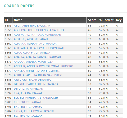Perolehan nilai siswa dapat dilihat pada bagian Grade Papers. Grade Papers ini berisi data perolehan nila semua siswa . Pada kolom Name, warna siswa memiliki warna biru.