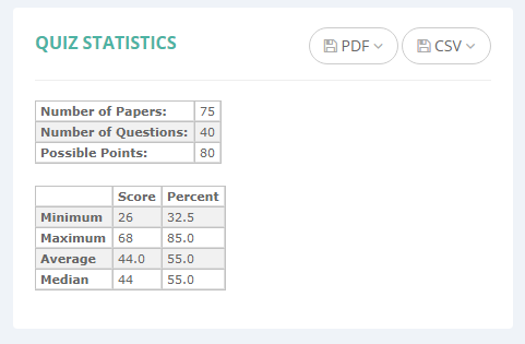 Statitik ujian yang meliputi Jumlah peserta, jumlah soal, skore maksimal yang dapat diperoleh jika jawaban benar semua. Statistik sederhana yang meliputi berapa nilai tertinggi (maximum), nilai terendah (minimum), nilai rata-rata (average) dan median (nilai tengah).