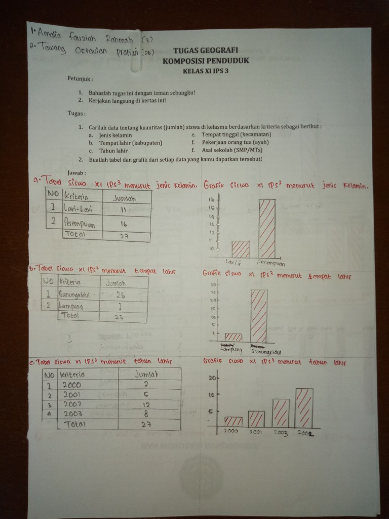 Hasil pekerjaan siswa dalam membuat tabel dan grafik hasil komposisi penduduk menurut jenis kelamin, tahun lahir dan tempat lahir