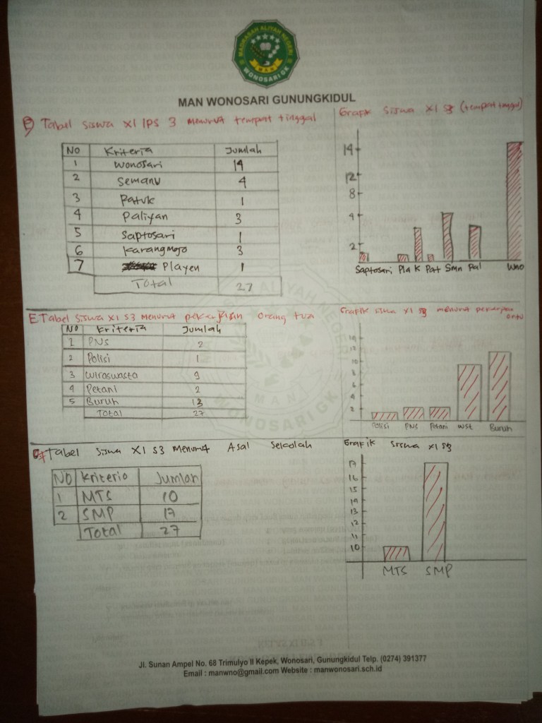 Hasil pekerjaan siswa dalam membuat tabel dan grafik hasil komposisi penduduk menurut kecamatan tempat tinggal, pekerjaan orangtua dan asal sekolah/madrasah sebelumnya.