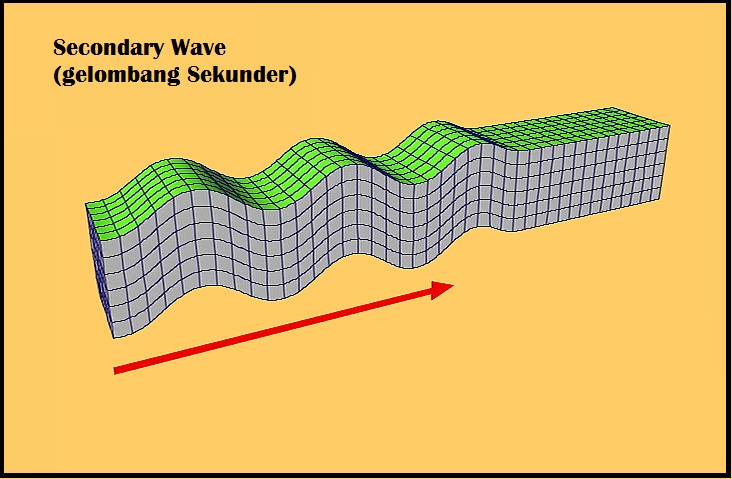 Gelombang Sekunder adalah gelombang yang muncul setelah gelombang primer terjadi dengan ciri-ciri bersifat tranversal (tegak lurus dengan arah rambatan), kecepatan 60% dari gelombang primer, amplitudo lebih besar dari gelombang primer, merambat pada lapisan padat dan memiliki efek merusak yang lebih besar dari pada gelombang primer.