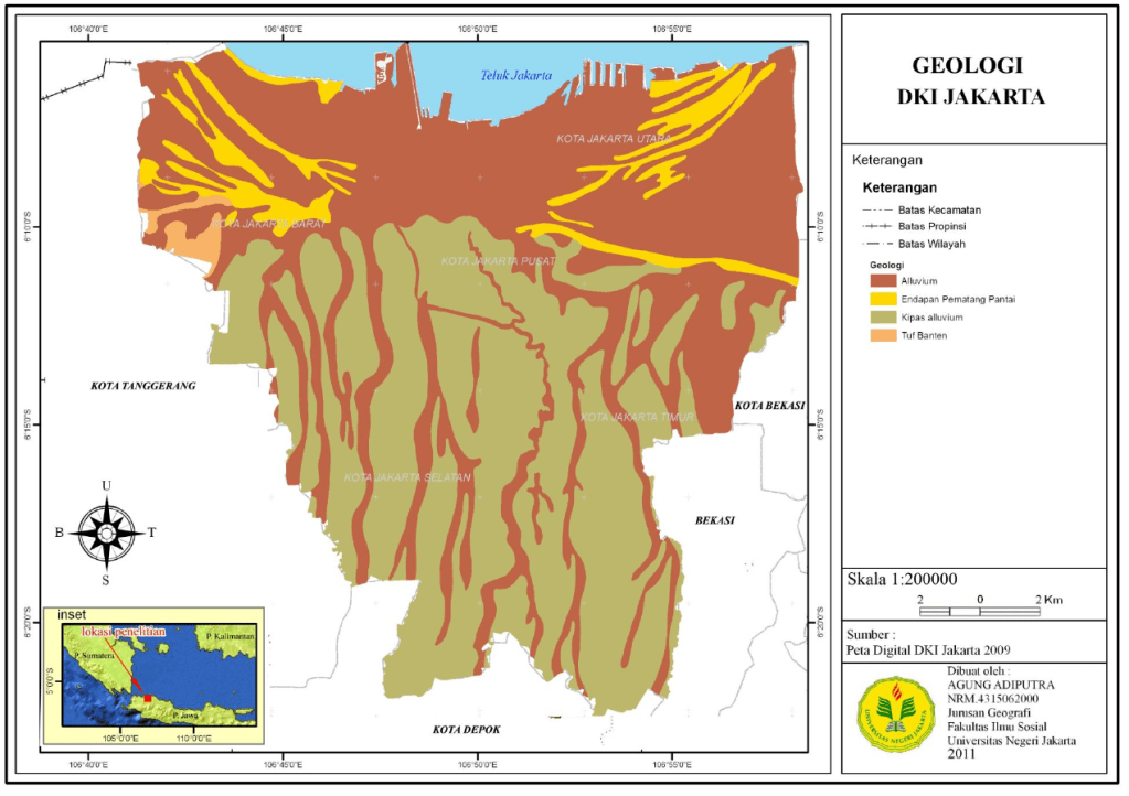 - Dari data di atas dapat diketahui bahwa Jakarta secara alami terletak di daerah dataran rendah yang akan selalu dilewati air. Dominasi struktur geologi aluvium di utara dan kipas aluvial di selatan menunjukkan bahwa secara keruangan Jakarta merupakan wilayah yang akan selalu bersinggungan dengan aliran dan genangan air. Hal ini semakin diperkuat dengan banyaknya sungai yang melewati Jakarta. Sudah tentu jika pada saat musim penghujan terjadi hujan dengan intensitas tinggi dan lama maka wilayah ini akan berpotensi tergenang oleh air.