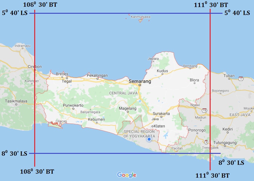 Sebagai contoh misalnya adalah lokasi absolut wilayah propinsi Jawa Tengah pada gambar di atas. Berdasarkan letak astronomisnya, propinsi Jawa Tengah terdapat di 5o 40β LS β 8o 30β LS serta 108o 30β BT β 111o 30β BT. Lokasi pada contoh di atas merupakan lokasi secara areal dimana pada wilayah tersebut terdapat empat perpotongan antara garis bujur dengan garis lintang yang setelah ditarik garis lurus akan menjadi polygon berbentuk persegi.