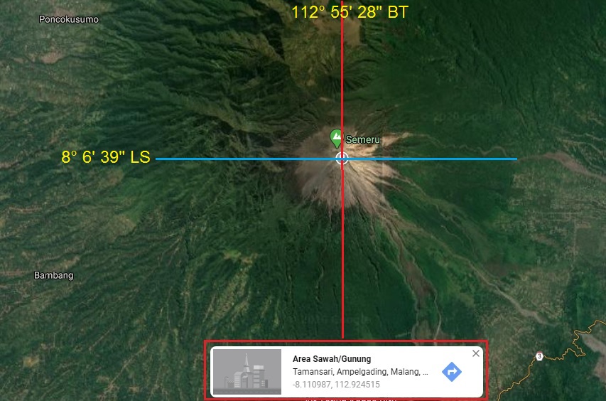 Sedangkan pada contoh di atas adalah lokasi titik suatu lokasi astronomis suatu tempat di permukaan bumi, yaitu puncak Mahameru gunung Semeru Jawa Timur yang terletak di perpotongan garis lintang 8Β° 6′ 39″ LS dan garis bujur 112Β° 55′ 28″ BT. Lokasi titik ini banyak digunakan untuk berbagi lokasi (share location) antar manusia dengan menggunakan Google Maps.