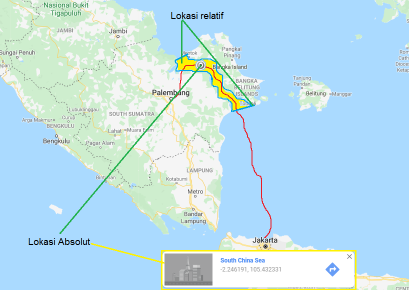 Bentuk penerapan lokasi absolut dan realitif ini misalnya Amir melakukan melakukan ekspedisi perjalanan menggunakan perahu dari Jakarta menuju Palembang dengan rute mulai dari Ancol ke Jembatan Ampera di sungai Musi. Dengan rute tersebut Amir akan melewati laut Jawa, selat Bangka dan sungai Musi hingga sampai tempat tujuan.