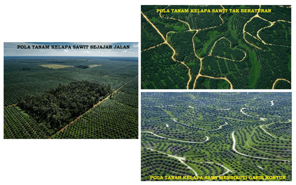 Pola tanam perkebunan kelapa sawit membentuk pola-pola yang bervariasi menyesuaikan dengan kondisi lingkungan sekitar. Pada daerah dataran rendah dengan jalan lurus dan persimpangan membentuk persegi, pola tanam kelapa sawit dibuat sejajar dengan jalan. Pada dataran dengan banyak rawa atau bekas aliran sungai dan jalan tidak beraturan, pola tanam kelapa sawit juga tidak beraturan. Sedangkan pada daerah berbukit pola tanam kelapa sawit membentuk pola sejajar dengan garis kontur.