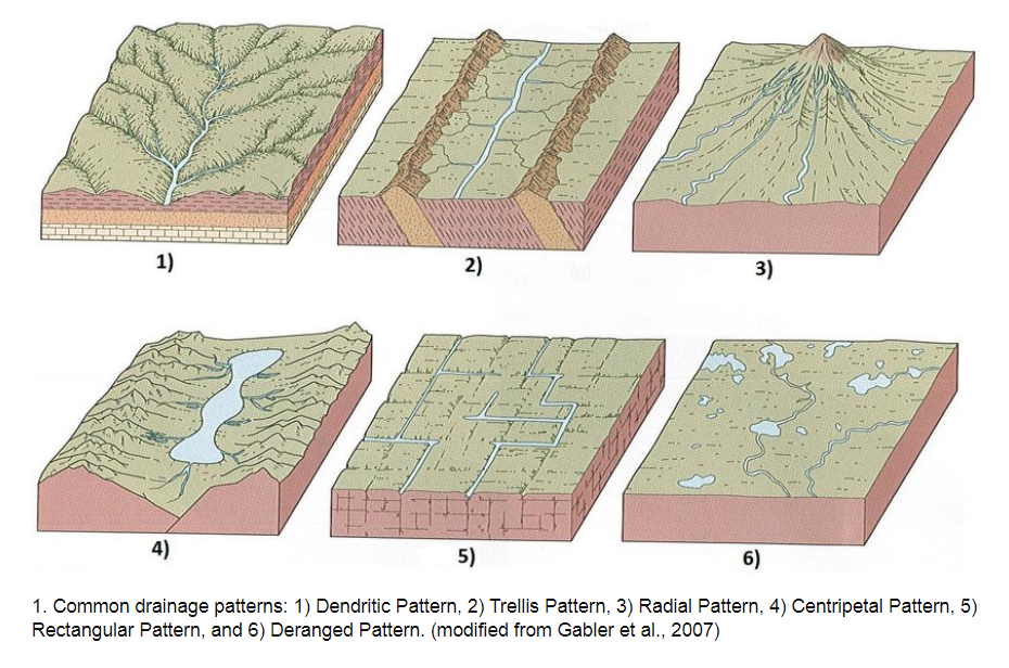 Sungai yang melewati daerah dataran rendah dengan struktur batuan homogen akan memiliki pola aliran berbentuk sirip-sirip daun (dendritik). Sungai yang terdapat di daerah dengan dua bidang patahan dan akan memiliki pola aliran dengan berbentuk trellis dengan anak sungai hampir sejajar dengan sungai utama. Daerah depresi yang terdapat di lembah di antara gunung/pegunungan akan menjadi saluran masuk aliran sungai dengan pola centripetal, sedangkan.