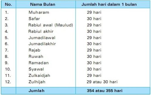 - Jumlah hari dalam setiap bulan pada kalender Masehi antara 28 – 31 hari, sedangkan pada kalender Hijriyah antara 29 – 30 hari
