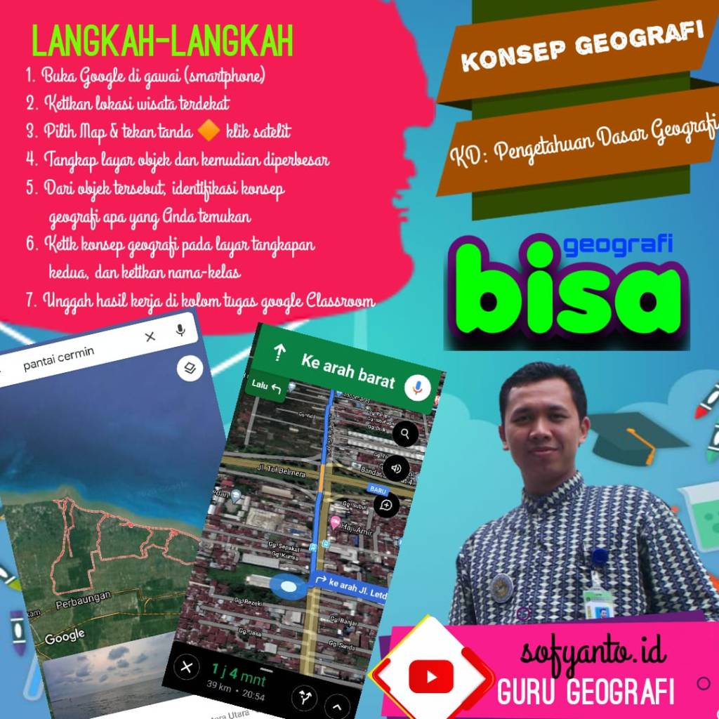 Pada materi pembelajaran Pengetahuan Dasar Geografi subbab Konsep Geografi pak Sofyanto mengajak siswa menggunakan gawai yang dimiliki untuk melakukan pengamatan visual permukaan bumi berbasis foto udara di Google Map.