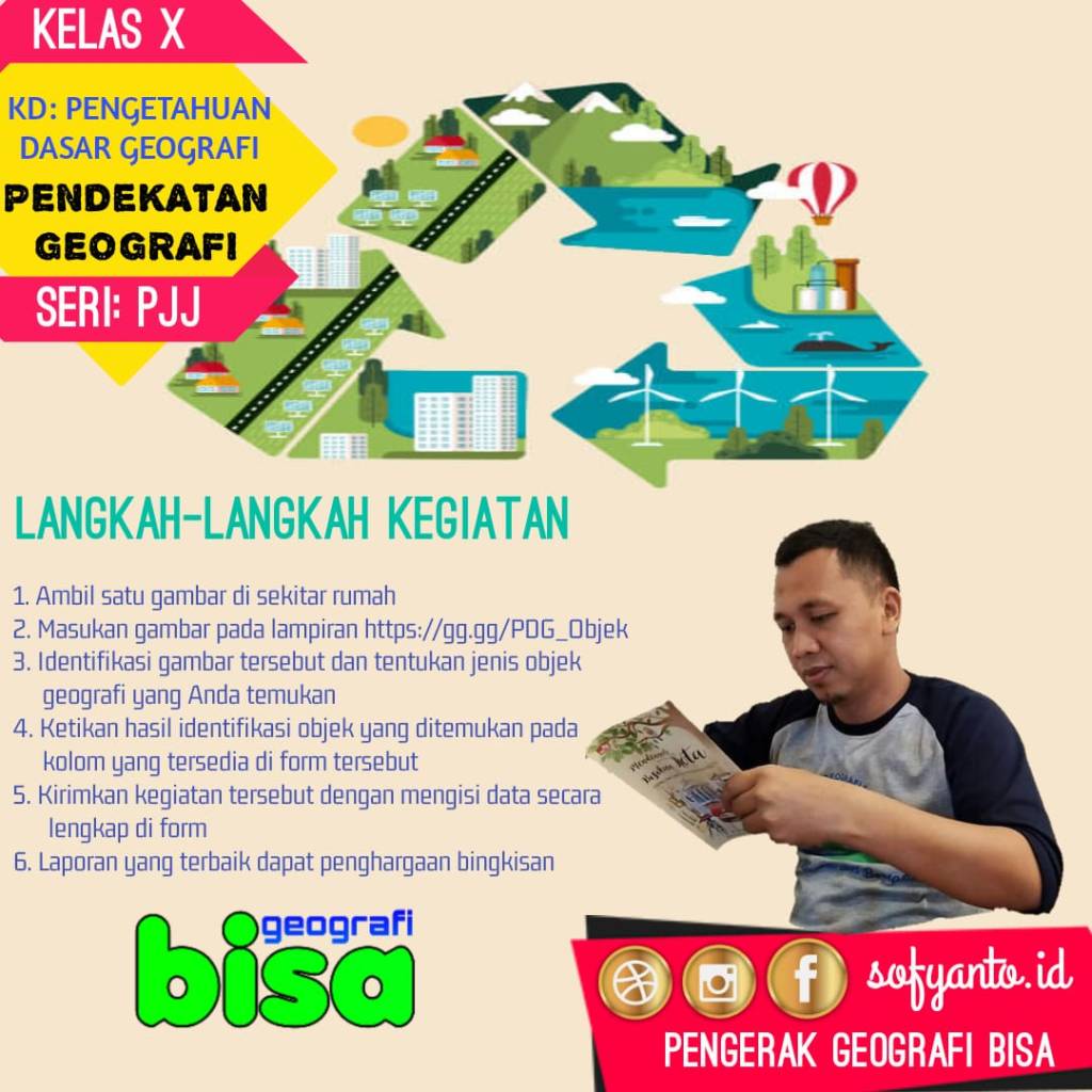 Pendekatan geografi merupakan objek formal dalam ilmu geografi. Materi ini sering membuat siswa kesulitan memahami. Oleh pak Sofyanto materi ini dibuat sederhana dengan meminta siswa mengambil gambar/foto obyek yang ada di sekitar rumah tempat tinggal siswa.