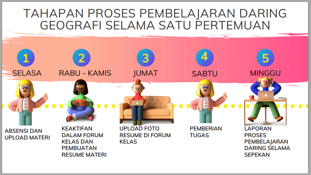 - Pada hari Jumat peserta didik mengupload resume materi yang dipelajari. Batasan waktu yang diberikan adalah sampai dengan pukul 24:00 malam.
