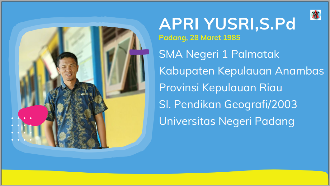 Apri Yusri, atau biasa dipanggil pak Apri adalah guru hebat tersebut. Beliau mengajar di SMAN 1 Palmatak Kabupaten Kepulauan Anambas Provinsi Kepulauan Riau. Seorang guru yang memanfaatkan aneka media sosial sebagai sarana untuk melaksanakan kegiatan belajar mengajar. Sering juga dijuluki sebagai Guru Geografi Tiktok, karena memanfaatkan aplikasi Tiktok untuk menyampaikan materi Geografi.