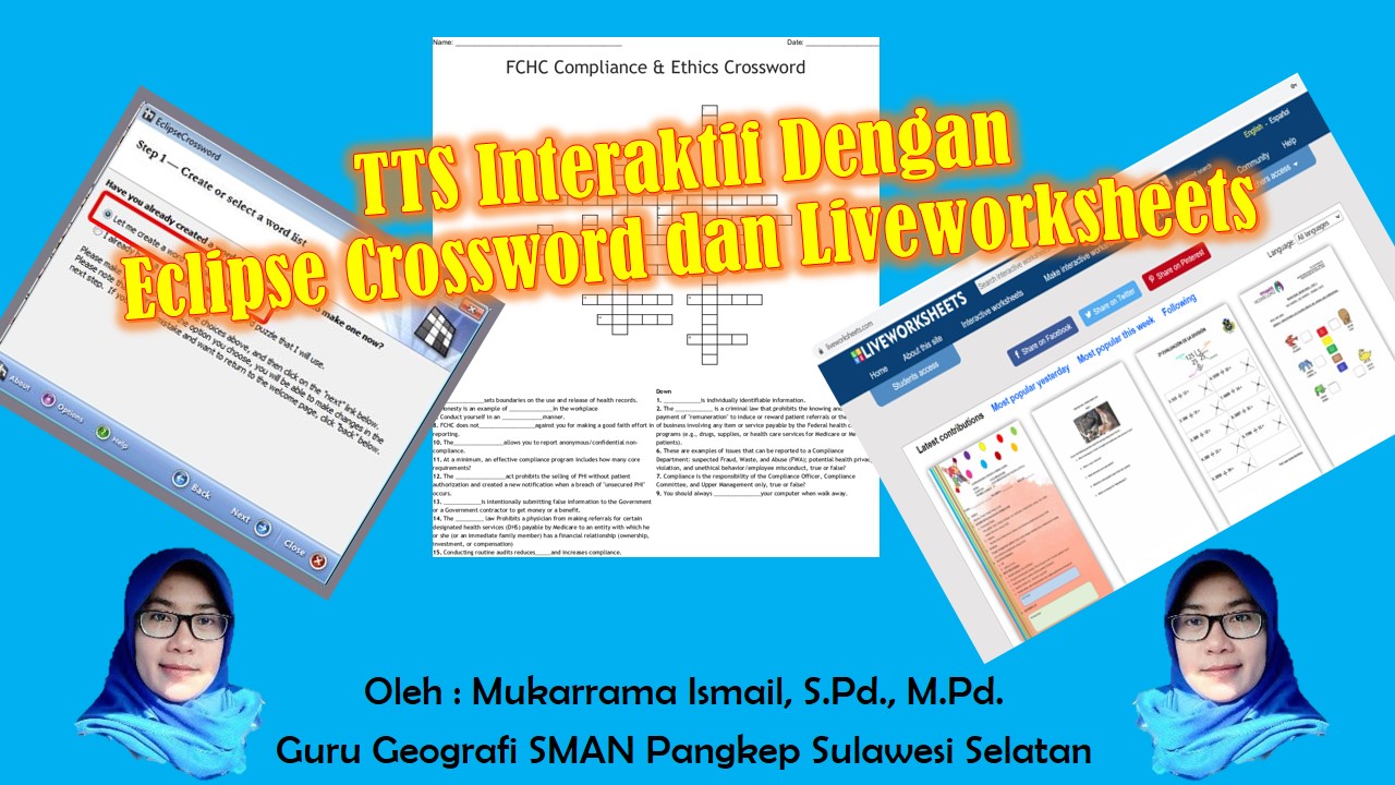 Anda tentu tidak asing dengan TTS atau Teka-Teki Silang bukan? Sebuah kuis atau soal yang bertujuan untuk melatih sejauh mana daya ingat kita terhadap berbagai hal yang terekam dalam memori kita. Sesuai namanya teka-teki silang merupakan kolom jawaban yang terdari dari jawaban dengan urutan huruf secara horisontal dan vertikal. Pertanyaan-pertanyaan terdapat di luar kolom jawaban dan biasanya terdapat di bagian bawah atau sekitarnya. Mengisi jawaban … Lanjutkan membaca Mukarrama Ismail – TTS Interaktif Dengan Eclipse Crossword Dan Liveworksheets