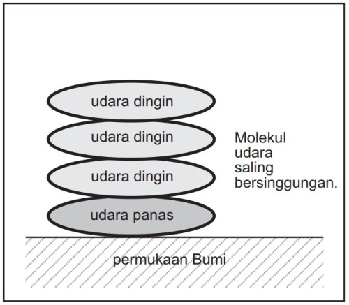 - Konduksi ialah pemanasan secara kontak langsung atau bersinggungan langsung. Pemanasan ini terjadi karena molekul-molekul udara yang dekat dengan permukaan bumi akan menjadi panas setelah bersinggungan dengan bumi yang memiliki panas dari dalam.