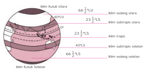 - Daerah iklim tropis, berada pada 0° LU – 23½° LU dan 0° LS – 23½° LS.