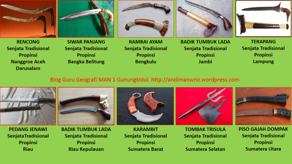 Beberapa senjata tradisional yang dimiliki setiap propinsi di pulau Sumatera antara lain sebagai berikut :