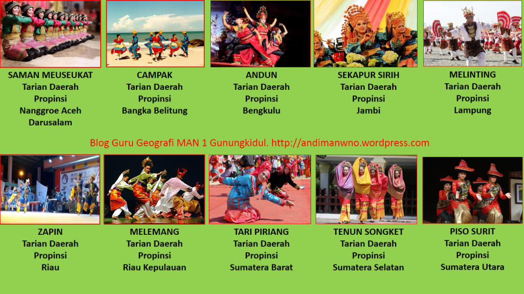 Beberapa contoh tarian daerah pada setiap propinsi di pulau Sumatera tersebut antara lain adalah :