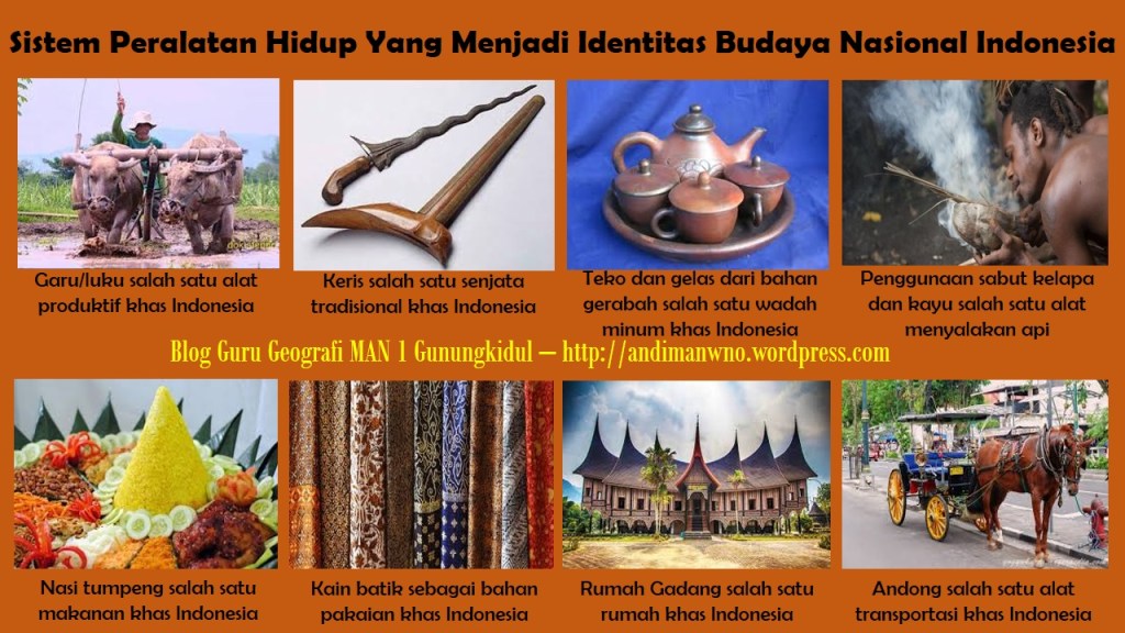 Sistem peralatan hidup dan teknologi pada budaya nasional Indonesia mengadopsi berbagai sistem peralatan hidup yang berasal dari budaya daerah. Beberapa contoh sistem peralatan hidup budaya daerah yang menjadi identitas Indonesia berkaitan dengan budaya nasional misalnya :