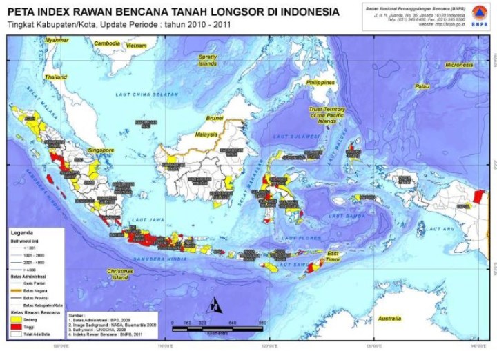 Pada peta di atas diketahui terdapat cukup banyak wilayah di Indonesia yang rawan terhadap bencana tanah longsor antara lain Sumatra Barat, sebagian besar wilayah di pulau Jawa, Sulawesi, Nusa Tenggara, Halmahera dan Papua bagian utara. Lebih lanjut dalam buku Indeks Rawan Bencana Indonesia yang dikeluarkan oleh BNPD pada tahun 2011 disebutkan terdapat 64 kabupaten di Indonesia yang termasuk dalam kawasan rawan bencana tanah longsor dengan kategori kelas tinggi dan 115 kabupaten dengan kelas sedang. Berdasarkan data tersebut maka diperlukan manajemen penanggulangan bencana yang matang untuk meminalisir dampak yang ditimbulkannya bila sampai terjadi bencana tanah longsor.