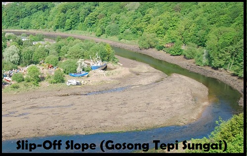 Slip-off slope terdapat di sebelah dalam gosong tepi sungai yang terbentuk dari material-material sedimen yang dibawa oleh sungai diendapkan sebagai akibat dari aliran air yang melambat karena adanya kelokan sungai (meander).