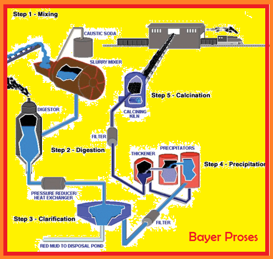 - Proses Bayer, yaitu proses pemurnian bijih bauksit untuk memperoleh aluminium oksida (alumina) melalui tahap