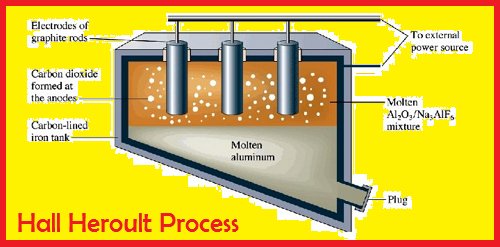 - Proses Hall-Heroult, yaitu proses peleburan aluminium oksida dengan cara reduksi melalui proses elektrolisis untuk menghasilkan aluminium murni.