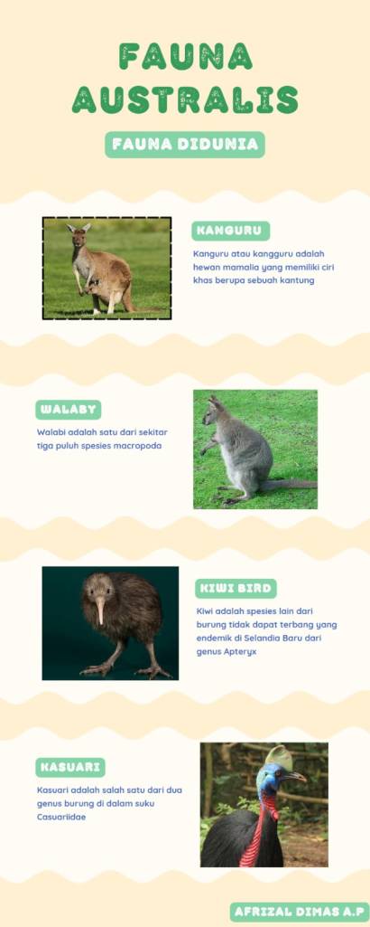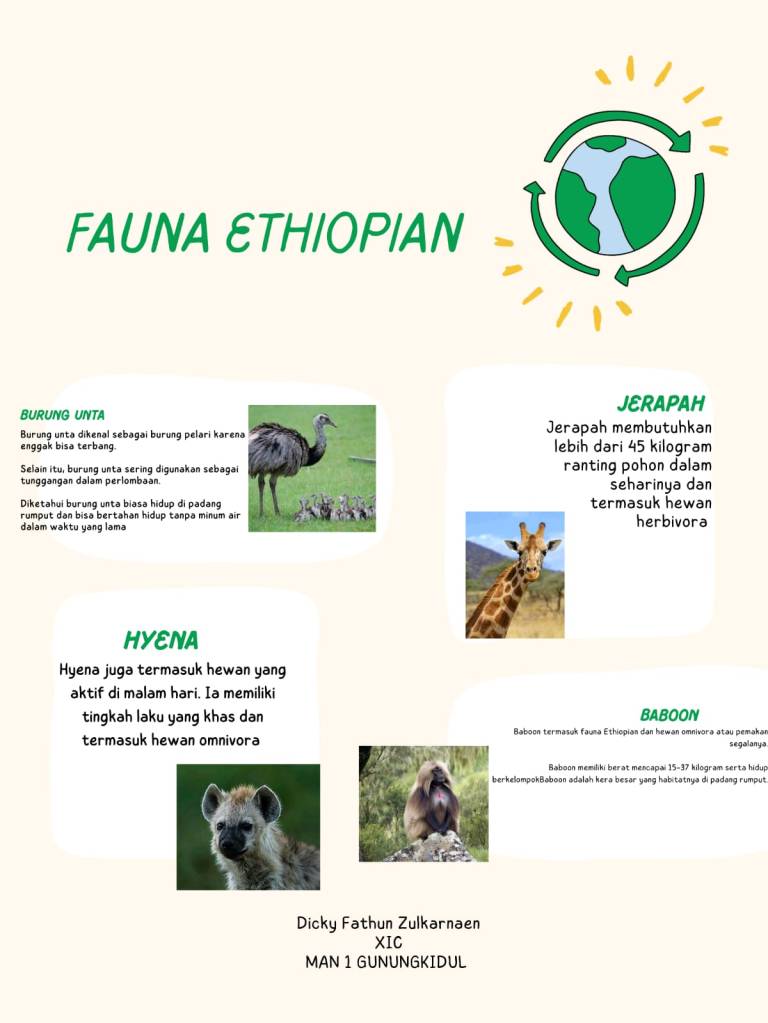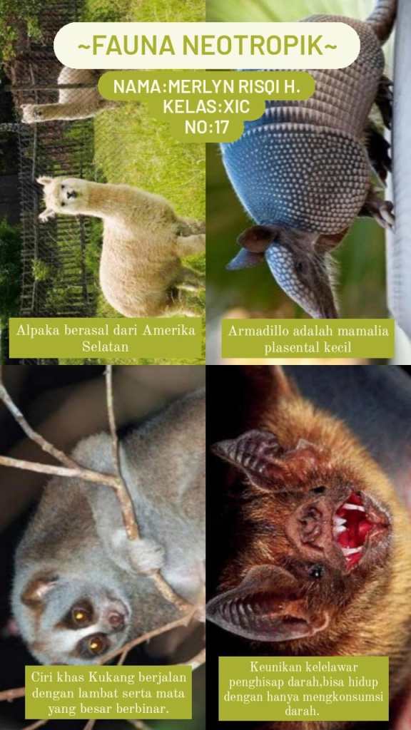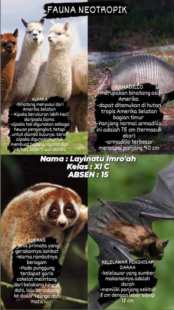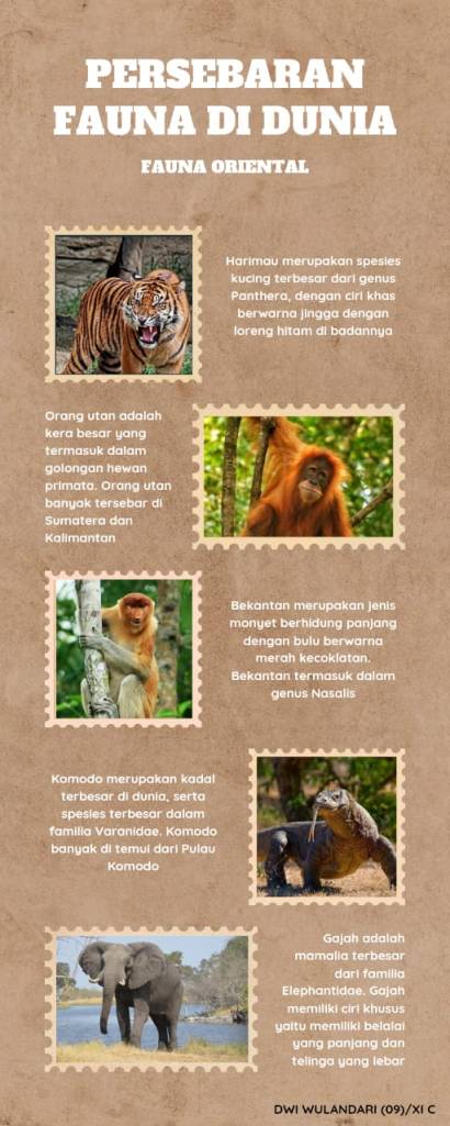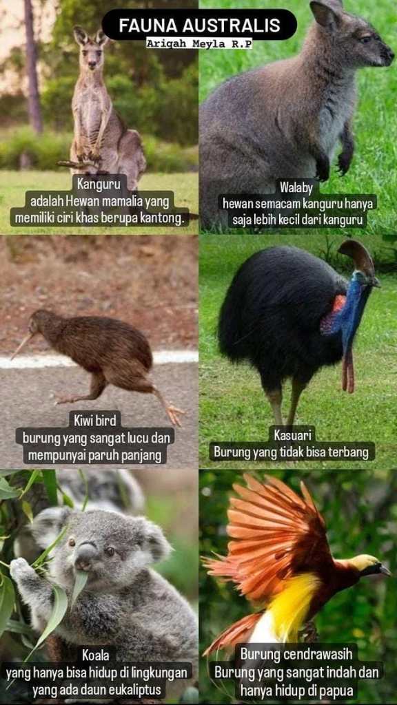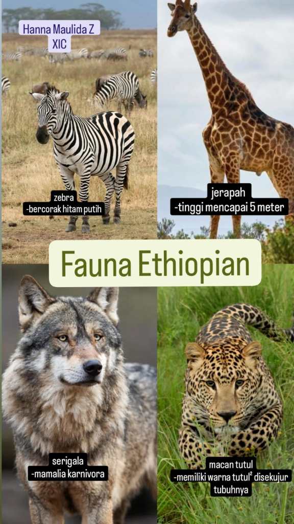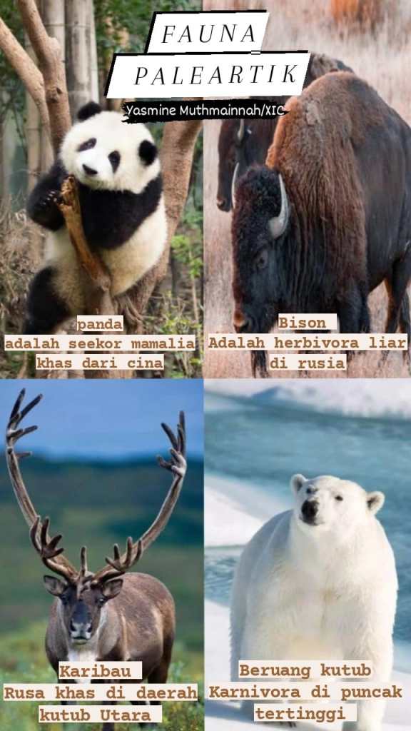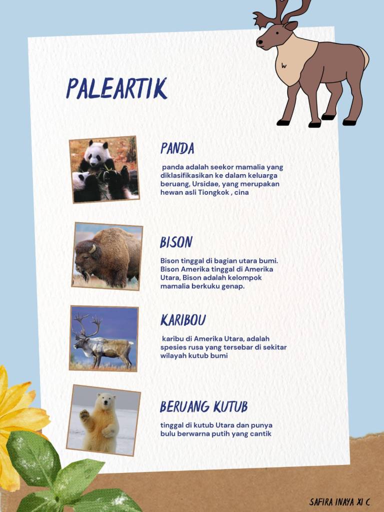 Kolase foto di atas merupakan gabungan foto-foto tentang persebaran fauna dunia yang terbagi menjadi 6 wilayah yaitu wilayah Australis, Ethiopian, Oriental, Neartik, Neotropik dan Paleartik. Kolase foto tersebut hasil karya siswa kelas XI C Mansageka 2023-2024.