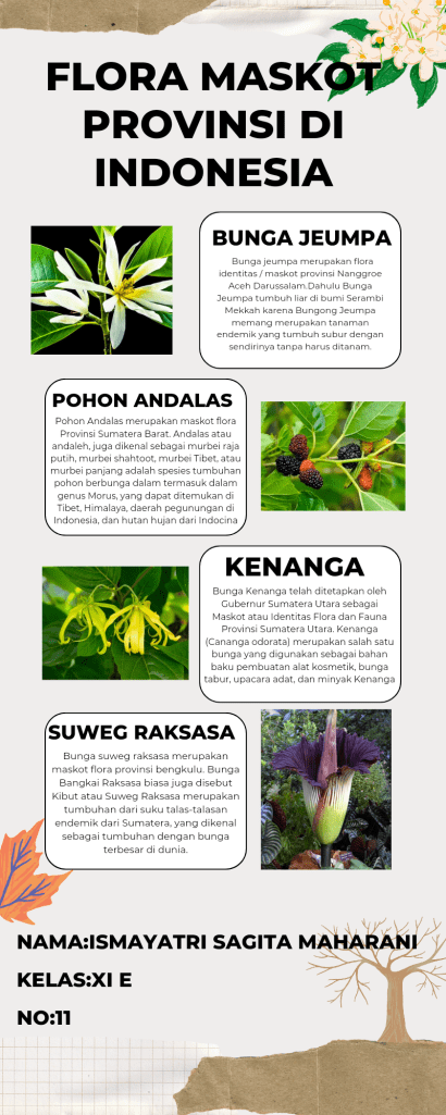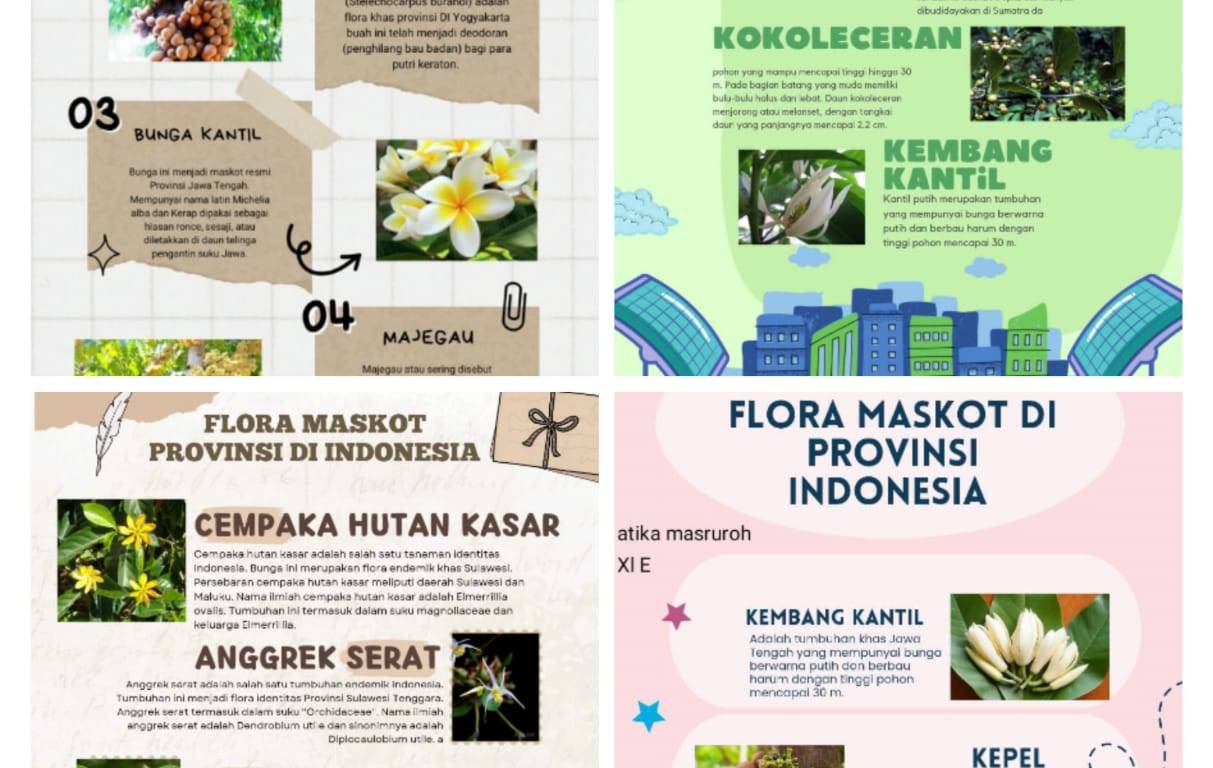 Kolase berikutnya adalah hasil karya siswa kelas XI E Mansageka 2023-2024 dengan tema sama seperti kelas XI D yaitu tentang persebaran flora Indonesia yang mengambil tema flora maskot setia provinsi di Indonesia. Karya-karya yang hebat dari para siswa. Ternyata hasil pekerjaan mereka luar biasa bagus, yang harus saya akui jika saya yang membuat mungkin tidak akan sebagus karya mereka.