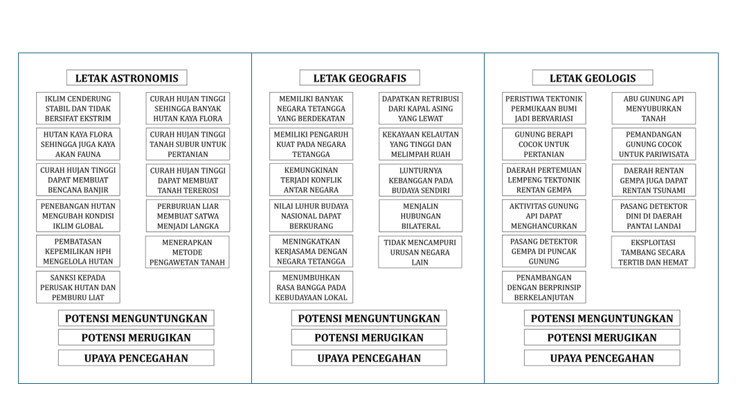 Ada 3 kategori utama tentang potensi Indonesia berdasarkan letaknya, yaitu letak astronomis, geografis dan geologis. Pada setiap kategori memiliki tiga sub kategori yang sama yaitu potensi yang menguntungkan, potensi yang merugikan dan upaya pencegahan yang sebaiknya dilakukan. Kategori, sub kategori dan beberapa data yang sudah tertulis di kotak pada kertas tersebut kemudian dipotong-potong untuk kemudian diterapkan pada saat kegiatan pembelajaran. File media pilah dan tempel seperti di atas dalam format pdf dapat didownload di sini.