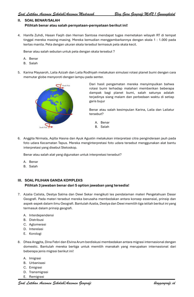 Geografi yang diberikan kepada peserta didik termasuk mapel yang diasesmenkan secara tertulis. Asesmen yang diselenggarakan mulai tahun ini bagi saya merupakan model baru dalam penilaian, terutama berkaitan dengan model soalnya. Jika pada penilaian terdahulu yang biasa disebut UMAD atau Ujian Madrasah, bentuk soal hanya terpaku pada pilihan ganda, isian singkat dan uraian maka pada asesmen ini mulai dapat diterapkan lebih hingga 3 model soal meliputi soal Pilihan Ganda, Pilihan Ganda Kompleks, Benar/Salah, Setuju/Tidak Setuju, Menjodohkan, Uraian tertutup (isian singkat) hingga Uraian terbuka (essai).